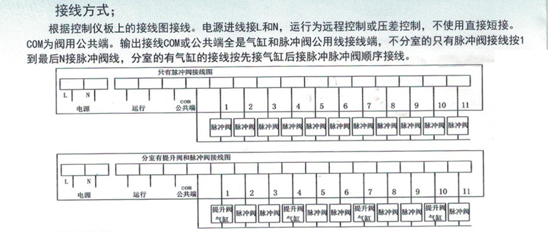 根據(jù)控制儀板上的接線(xiàn)圖接線(xiàn)。電源進(jìn)線(xiàn)接L和N,運(yùn)行為遠(yuǎn)程控制或壓差控制,不使用直接短接。COM為閥用公共端。輸出接線(xiàn)COM或公共端全是氣缸和脈沖閥公用線(xiàn)接線(xiàn)端,不分室的只有脈沖閥接線(xiàn)按1到后面N接脈沖閥線(xiàn),分室的有氣缸的接線(xiàn)按先接氣缸后接脈沖脈沖閥順序接線(xiàn)。