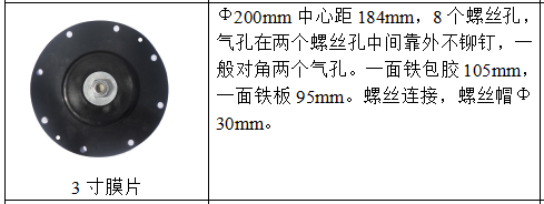 GOYEN-Z-76S脈沖閥膜片尺寸:Φ200mm中心距184mm,8個螺絲孔,氣孔在兩個螺絲孔中間靠外不鉚釘,一般對角兩個氣孔。一面鐵包膠105mm,一面鐵板95mm。螺絲連接,螺絲帽Φ30mm。